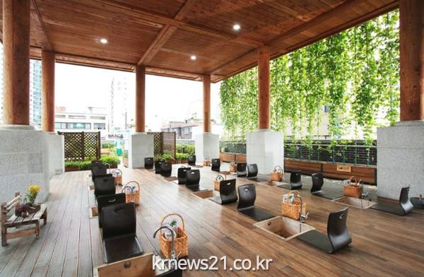 사방이 뚫린 아름다운 한옥 누각에 체험장이 마련돼 있어'동의보감' 속 건강 비법인 ‘두한족열(頭寒足熱)’을 직접 체험해 볼 수 있다.
