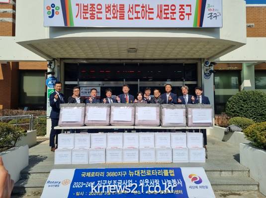 ▲ 사진=대전광역시 중구대전 중구 석교동(동장 강은숙)은 21일 국제로타리 3680지구 뉴대전로타리 클럽(회장 엄태환)에서 이불 15채와 라면 30상자(200만원 상당)를 기탁했다고 밝혔다.