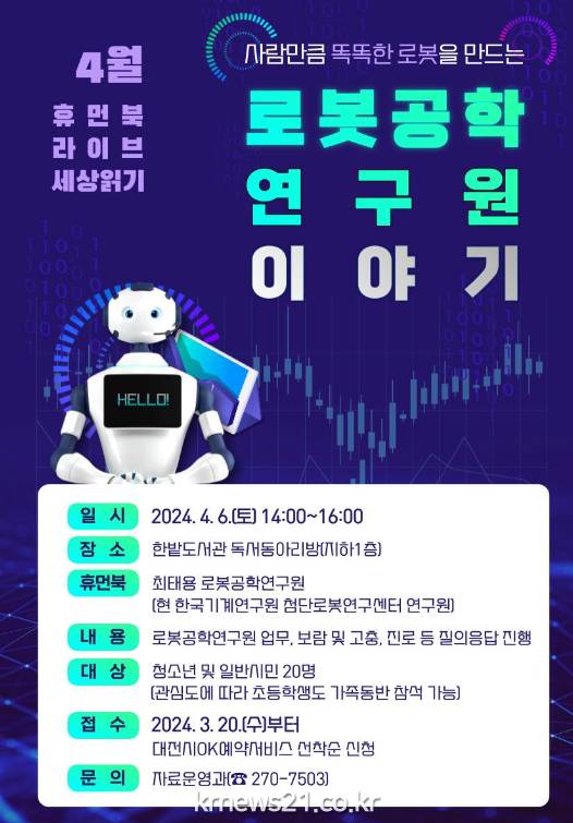 ▲ 사진=대전광역시대전 한밭도서관은 6일(토) 오후 2시, 최태용 로봇공학연구원과 함께하는‘휴먼북 라이브 세상읽기’를 진행한다.