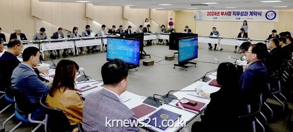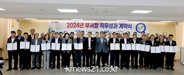보령시는 11일 시청 대회의실에서 김동일 시장을 비롯한 5급 이상 간부공무원 38명이 참석한 가운데 2024년 부서장 직무성과 계약식을 가졌다고 밝혔다.