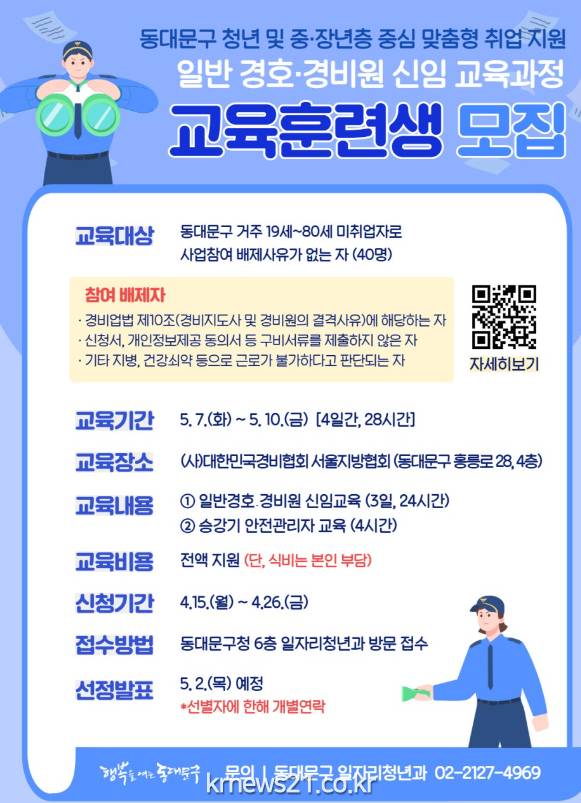 이필형 동대문구청장은 “일반 경호·경비원 신임 교육과정은 매년 참여자들의 만족도가 높고, 수료 시 경비 구인 업체로의 취업 연계율이 높은 사업”이라며, “올해 모집인원 및 연령이 확대된 만큼 경호·경비원으로 취업을 원하시는 많은 구민들이 지원하길 바란다. 앞으로도 관내 구직자가 취업에 성공할 수 있도록 취업역량 강화 프로그램을 지속적으로 발굴하겠다”고 밝혔다.