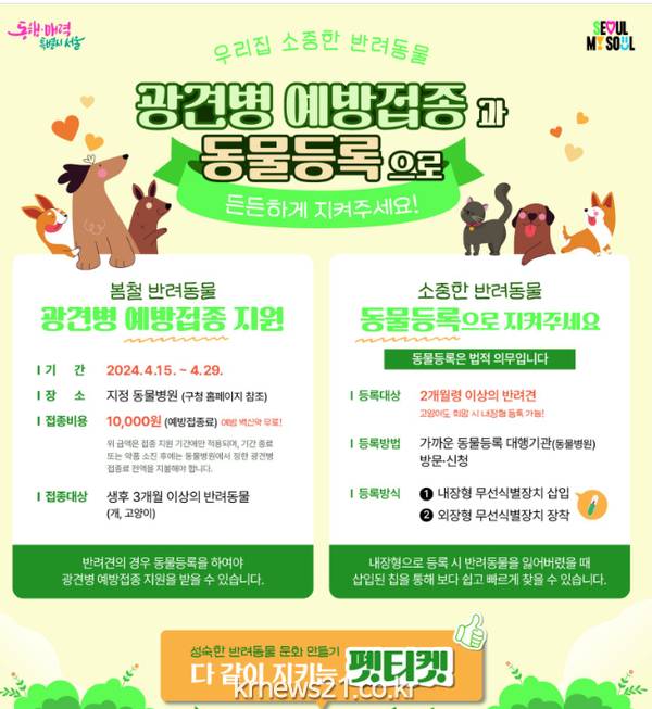 이에 은평구는 광견병 예방하고 반려동물 양육 가구의 의료비 부담을 덜기 위해 약 2천 마리의 광견병 예방 약품을 지역 동물병원에 공급하고 예방접종 지원에 나선다.