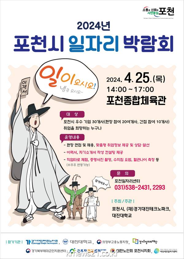 포천시 관계자는 “이번 2024년 포천시 일자리 박람회는 취업을 희망하는 누구나 참가할 수 있다. 박람회가 구직자에게는 취업 활동의 기회를, 기업에는 우수 인재를 공급하는 장이 돼 지역경제 활성화에 이바지하길 바란다”고 말했다.