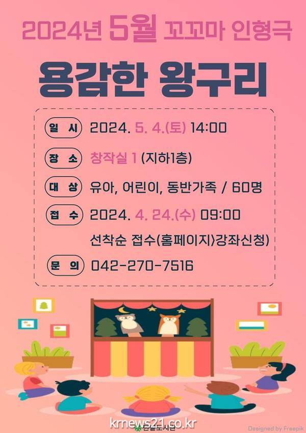 대전 한밭도서관은 유아, 어린이 가족을 대상으로 5월 4일 꼬꼬마 인형극‘용감한 왕구리’공연을 선보인다.