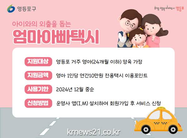 영등포구(구청장 최호권)가 영아를 둔 부모의 이동 편의를 돕는 ‘엄마아빠택시’ 사업을 작년에 이어 올해도 시행한다고 밝혔다.