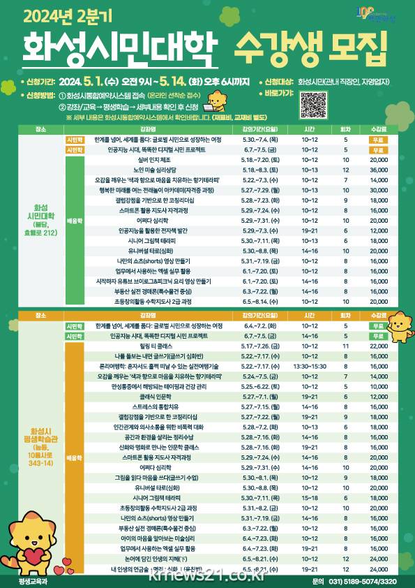 화성시(시장 정명근)는 다음 달 1일부터 14일까지 화성시민대학 2분기 수강생을 선착순 모집한다.