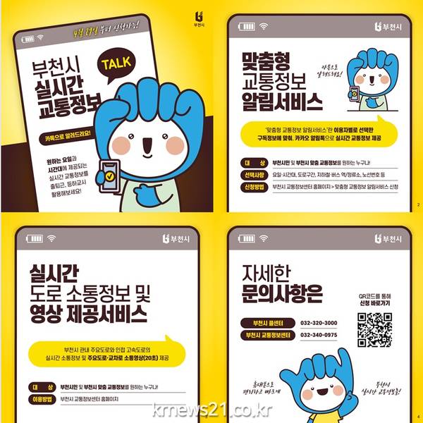 부천시는 4월 29일부터 ‘맞춤형 교통정보 알림서비스’를 개시하고 ‘부천시교통정보센터 홈페이지(이하 센터 홈페이지)’를 고도화해 시민들에게 실시간 교통정보를 제공한다. ‘맞춤형 교통정보 알림서비스’는 이용자가 가입 시 선택한 관내 도로소통상황, 버스·지하철 도착예정시간 등의 교통정보를 원하는 요일과 시간대에 정기적으로 받을 수 있는 구독형 서비스로 카카오 알림톡을 통해 받을 수 있다. 도로소통상황은 이용자가 원하는 도로구간의 실시간 소통상황과 영상을 제공하며, 사고 및 공사 정보는 교통정보센터 상황실에서 관제 중 도로소통에 영향을 줄 것으로 판단한 정보를 선별해 제공한다. 버스 및 지하철은 선택한 정류소 또는 역에 정차하는 버스노선이나 지하철의 도착예정시간을 알려준다. ‘맞춤형 교통정보 알림서비스’는 ‘센터 홈페이지(www.bcits.go.kr)’에서 신청할 수 있으며, 서비스를 통해 반복적인 출퇴근, 등하교 통행 시 효과적으로 활용될 것으로 기대된다. ‘센터 홈페이지(www.bcits.go.kr)’에서는 주요 교차로에 설치된 카메라에서 수집되는 실시간 영상을 20초 동안 제공하며 도로소통상황, 돌발상황 등을 확인해 시민들의 실시간 교통정보 체감도를 높일 수 있도록 고도화했다. |