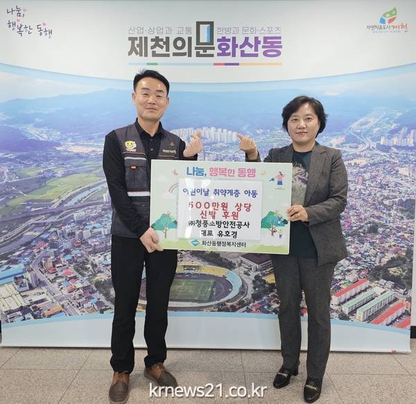 ㈜청풍소방안전공사 유호경 대표는 최근 화산동 행정복지센터를 방문하여 후원금 500만원을 기탁했다. 이날 기탁한 후원금은 화산동 관내 저소득층 아동·청소년들에게 신발 상품권을 지원할 예정이다.