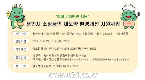 용인특례시(시장 이상일) 오는 20일부터 24일까지 ‘소상공인을 위한 재도약 환경개선 지원사업’ 신청을 접수한다고 6일 밝혔다.