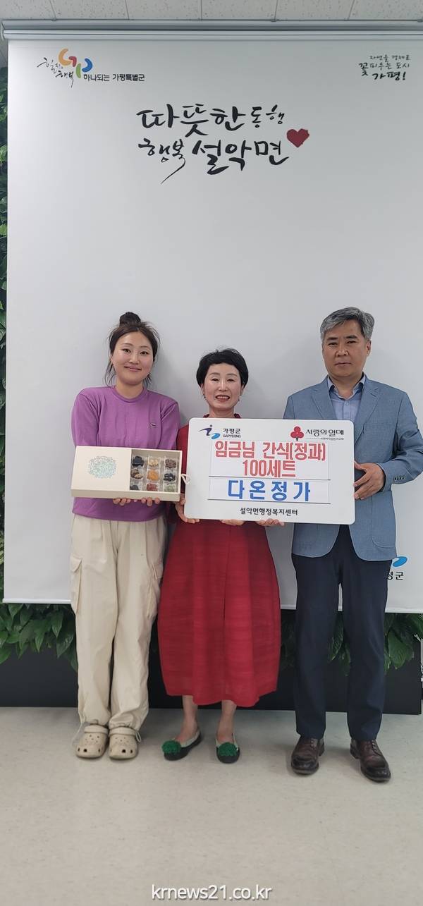 가평군 다온정가(밥꽃·대표 김지안)는 어버이날을 맞아 혼자 사시는 어르신께 전달해 달라며 지난 7일 손수 만든 300만원 상당의 임금님 간식(수제정과 9종) 100세트를 설악면행정복지센터에 기탁했다.