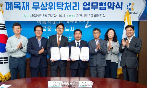 제천시는 7일 (주)천일에너지(대표이사 박상원)와 자원관리센터 폐목재 무상위탁처리 업무협약을 체결하였다.
