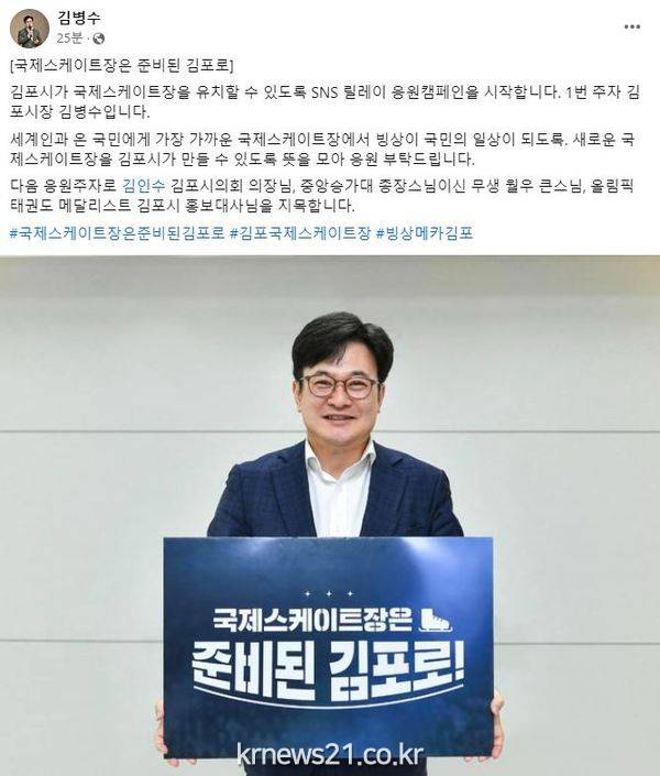 국제스케이트장 유치를 뜨겁게 열망하고 있는 김포시가 「국제스케이트장은 준비된 김포로!’ 전국 SNS캠페인」을 시작한다. 김포시는 세계인뿐 아니라 온 국민이 접근하기 좋은 교통과 지리적 위치를 강점으로, 대한민국 국제스케이트장을 유치해 빙상스포츠 붐을 일으키는데 기여할 각오다. 그 첫발인 「국제스케이트장은 준비된 김포로!’ 전국 SNS캠페인」은 김병수 김포시장을 필두로, 전국의 오피니언리더, 연예인부터 일반국민까지 지목받은 사람이나 자발적 참여자가 국제스케이트장 김포 유치 응원을 기록하고 다음 사람을 지목하는 방식으로 이어질 계획이다.