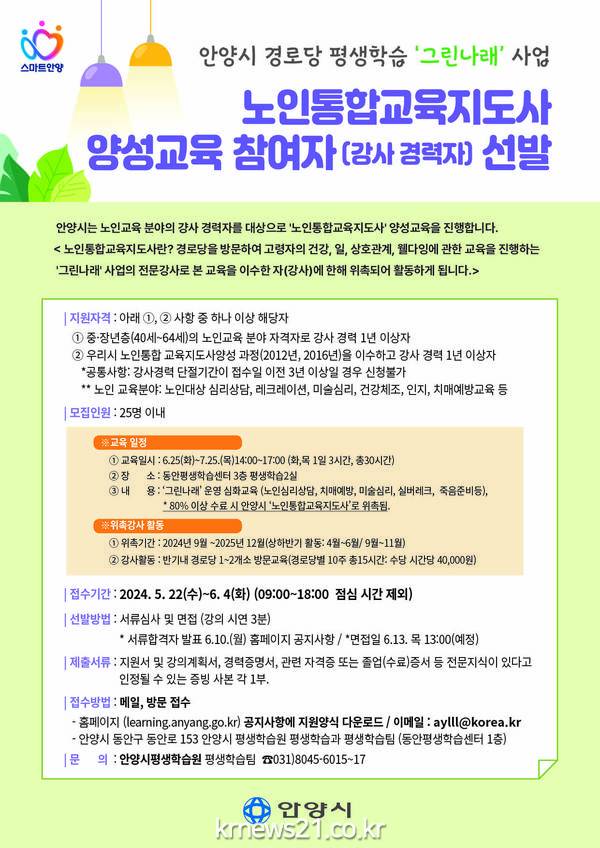 안양시는 경로당 평생학습 ‘그린나래’ 사업의 전담 강사인 ‘노인통합교육지도사’ 양성과정 참여자를 모집한다고 21일 밝혔다.