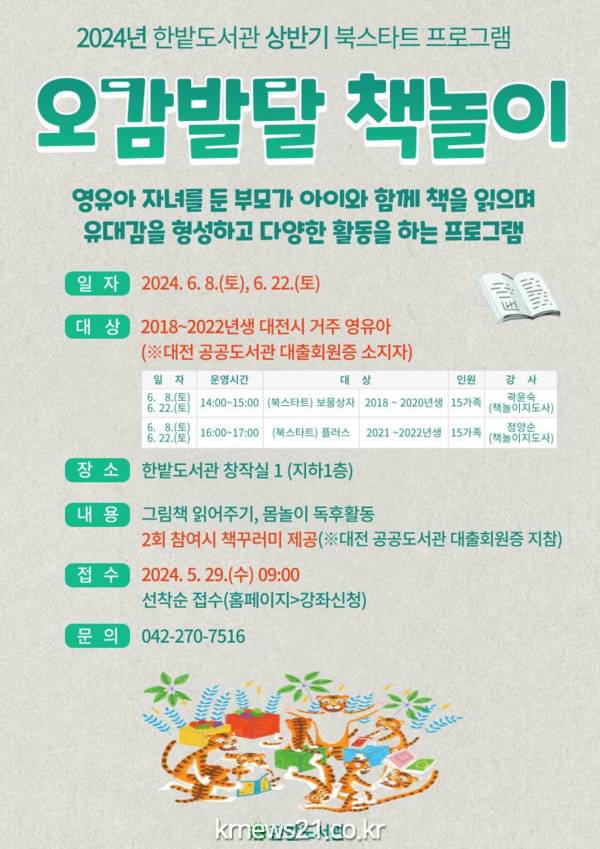 대전 한밭도서관은 6월 8일부터 대전지역 3세~7세 영유아의 행복한 책 읽기를 돕고 책 꾸러미를 선물하는 ‘북스타트’ 사업을 추진한다.