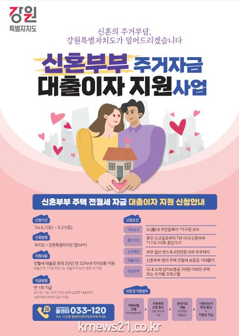 본 사업은 오는 6월 1일부터 8월 31일까지 우리도(강원특별자치도) 애플리케이션으로 신청 가능하며, 지원이 결정되면 지난 1년간의 이자 상환 비용이 지원(연간 1회, 300만원 한도 내)되며, 신혼부부 한 가구당 2년 동안 총 2회 지급된다.