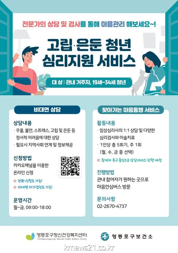 영등포구(구청장 최호권)가 다양한 심리지원 사업을 통해 고립 은둔 및 저활력 청년들의 신속한 일상 회복과 심리적 어려움 해소에 적극 동참한다고 밝혔다.
