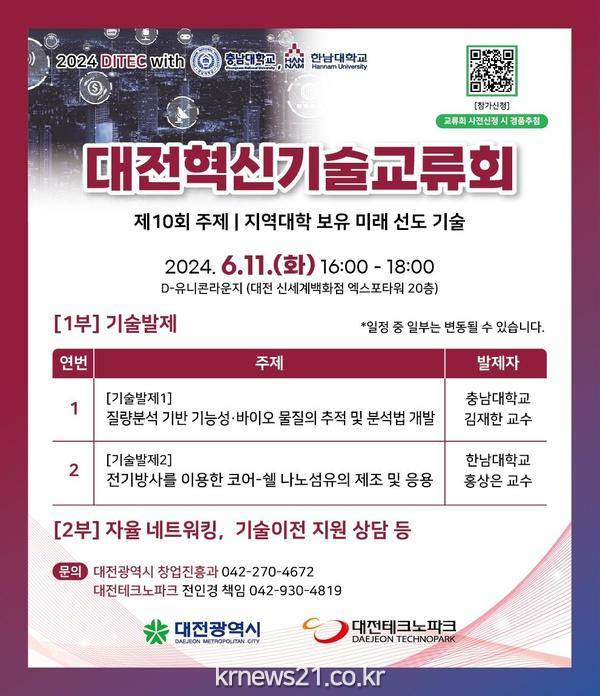 대전시는 11일 신세계 엑스포타워 20층 D-유니콘라운지에서 올해 열 번째‘대전혁신기술교류회(DITEC)’를 개최하고 지역대학 보유 미래 선도 기술을 선보인다.