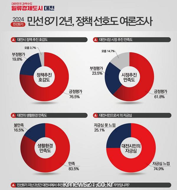 대전시가 민선 8기 2주년을 맞아 역점 정책에 대한 선호도를 조사한 결과, 시민 76.5%가 대전시 발전과 시민 생활에 도움이 된다고 긍정적으로 평가한 것으로 나타났다.