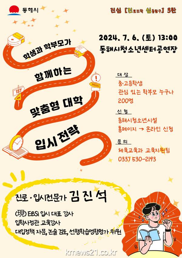 동해시(시장 심규언)가 진로진학에 진심!(진로진학·심층탐구) 프로젝트 진심 3탄!으로, 진로‧입시 관련 분야 전문가를 초청, 맞춤형 대학 입시 전략 특강을 개최한다고 밝혔다.
