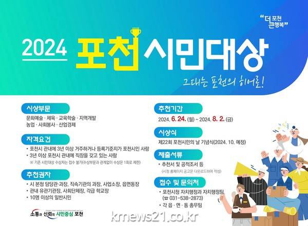 포천시(시장 백영현)는 오는 8월 2일까지 「2024 포천시민대상」 후보자 추천을 접수받는다.
