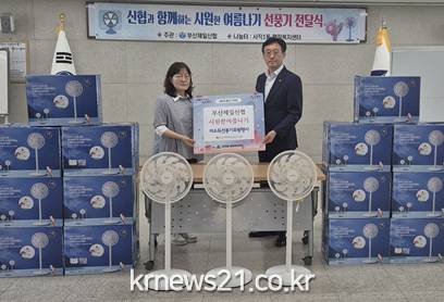 부산시 동래구 사직1동(동장 임귀옥)은 지난 10일 온천동에 있는 부산제일신협(이사장 이정재)으로부터 폭염 취약계층을 위한‘시원한 여름나기 선풍기’30대를 전달받았다고 밝혔다.