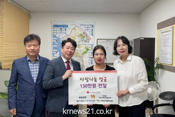 검단신도시 아라동 소재 원당교회(담임목사 양승철)는 지난 17일 아라동행정복지센터(동장 김은자)에 사랑나눔 기탁금 1,300천원을 전달했다.