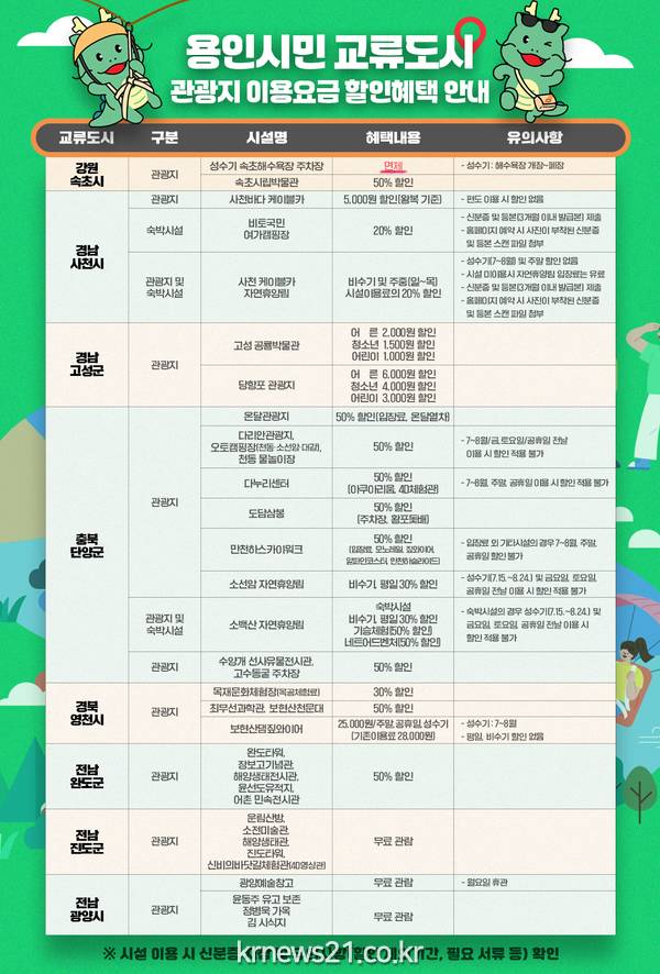 용인특례시(시장 이상일)는 국내 자매결연을 맺은 교류 도시들이 용인시민들에게 다양한 관광시설 할인 혜택을 제공한다고 24일 밝혔다.