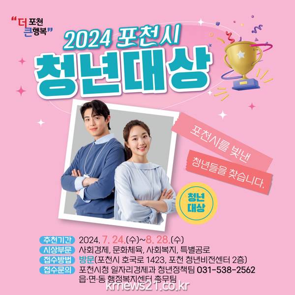 포천 청년대상은 청년이 지역사회의 발전을 이끄는 사회 구성원으로 성장할 수 있도록 사회경제, 문화체육, 사회복지, 특별공로 등 4개 부문에서 역량을 발휘한 청년 유공자에게 수여하는 상이다.