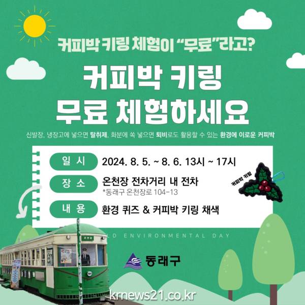 부산 동래구(구청장 장준용)는 오는 8월 5일부터 8월 6일까지 2일간 온천장 전차거리 내 전차에서 환경보호 실천을 위한 커피박 키링 체험부스를 운영한다고 밝혔다.