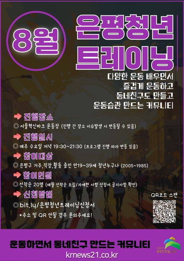 은평구(구청장 김미경)는 청년들의 건강한 운동문화 확산을 위해 ‘은평청년 트레이닝’ 참여 청년을 모집한다고 밝혔다.