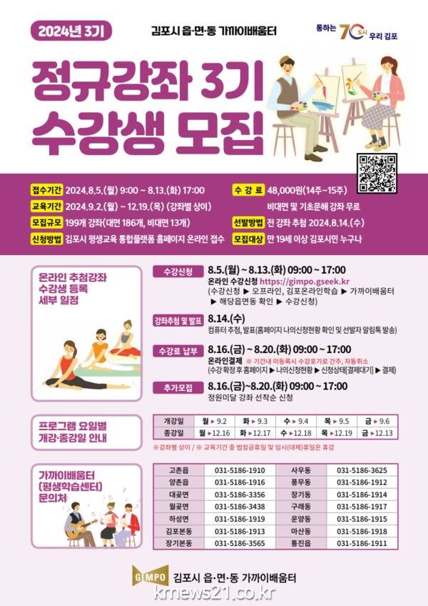 김포시 읍면동 가까이배움터(평생학습센터)에서 8월 5일부터 8월 13일까지 올해 마지막 제3기 정규강좌 수강생을 모집하며, 김포시민이라면 누구나 읍면동의   가까이배움터에서 다양한 평생교육의 기회를 누릴 수 있다.