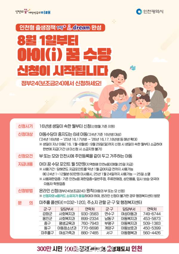 인천광역시는 오는 8월 1일부터 1억+ 아이드림 사업의 일환으로 추진되는 ‘아이 꿈 수당’의 신청·접수를 시작한다고 밝혔다.