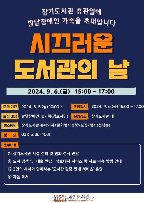김포시 장기도서관은 휴관일인 9월 6일(금) 15시부터 17시까지 평소 도서관 이용이 어려운 발달장애인 가족을 대상으로 ‘시끄러운 도서관의 날’을 운영한다.