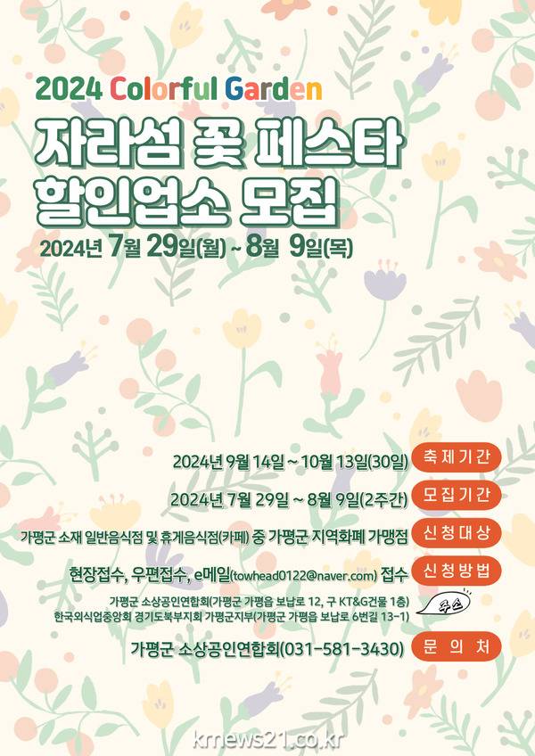 가평군은 가평군소상공인연합회에서 ‘자라섬 꽃 페스타(가을)’와 연계해 축제장 방문객 대상 음식점 할인이벤트에 참여할 업소를 8월 9일까지 모집한다고 29일 밝혔다.