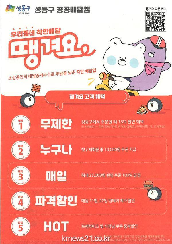 정원오 성동구청장은 “성동형 공공배달앱 ‘땡겨요’가 고물가 시대에 어려움을 겪고 있는 소상공인의 매출 향상과 주민들의 가계 부담 해소에 많은 도움이 되길 바란다”라며, “소상공인과 주민 모두 함께 상생하며 지역 경제를 활성화할 수 있도록 세심한 지원을 이어갈 것”이라고 말했다.
