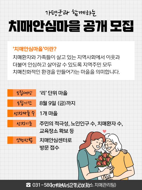 가평군보건소 치매안심센터가 오는 8월 9일까지 ‘치매안심마을’을 공개 모집한다.