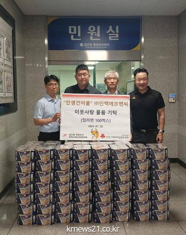 검단동 행정복지센터(동장 김명진)는 7월 29일 ‘인생건어물’을 운영하는 ㈜인맥에프엔씨(대표 고형기)로부터 관내 소외계층지원을 위한 사랑의 라면 100박스를 기탁받았다.