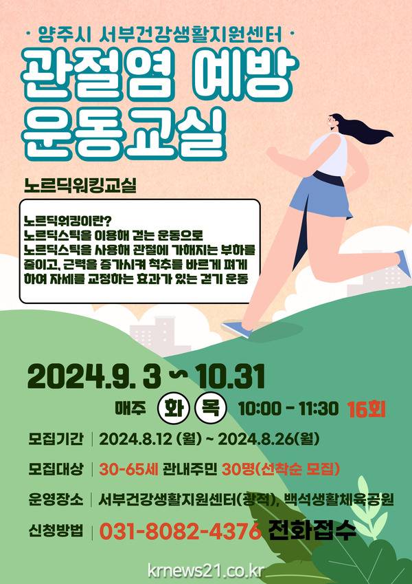 양주시(시장 강수현)가 오는 8월 12일부터 관내 30세부터 65세 시민을 대상으로 ‘2024년 2기 관절염 예방 운동 교실(노르딕워킹 교실)’ 참여자 30명을 선착순 모집한다고 밝혔다.