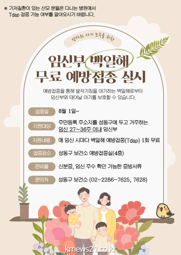 이에 성동구는 감염에 특히 취약한 임신부에게 백일해 예방접종을 무료로 지원한다.