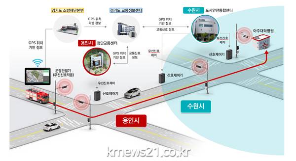 ‘광역 긴급차량 우선신호시스템’은 대형 화재나 위급상황 발생 시 경우 시·군 경계를 넘어 출동하는 긴급차량이 정지신호를 받지 않고 우선신호를 받아 목적지까지 신속하게 이동할 수 있도록 돕는 첨단 신호체계다.