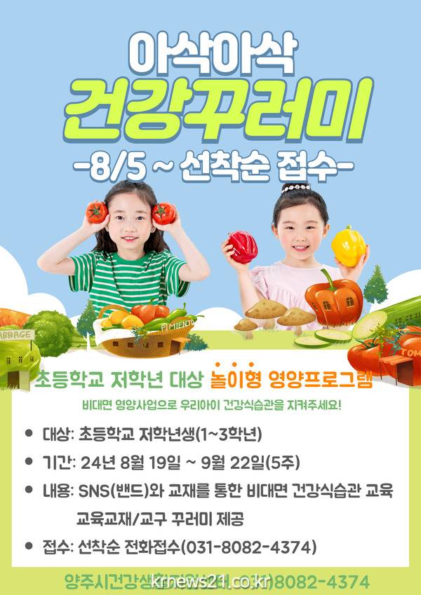 양주시(시장 강수현)는 오는 5일부터 보건소 건강생활지원센터가 초등학교 저학년을 대상으로 올바른 식습관 형성을 위한 비대면 놀이형 영양프로그램 ‘아삭아삭 건강꾸러미’의 참여자를 선착순 모집한다고 밝혔다.