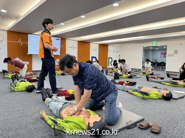 이날 교육은 ▲초기 응급처치 중요성 동영상 시청 ▲심폐소생술(CPR) 방법 ▲자동심장충격기(AED) 사용법 ▲기도 폐쇄 대처 하임리히법 순으로 진행됐다. 스마트 기기가 연동된 마네킹을 활용해 실제 상황을 재현하여, 참여자들은 멈춘 심장을 다시 살리는 올바른 방법을 직접 몸으로 배웠다.
