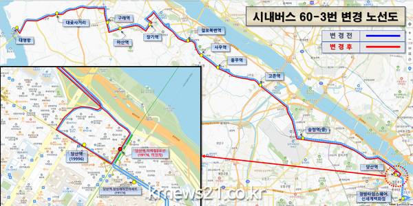김포시(시장 김병수)는 8월 16일부터 시내버스 60-3번 노선의 종점단축(경방타임스퀴어→당산역), 88번 노선의 종점단축(영등포시장→송정역) 및 김포공항역3번출구 경유 노선변경을 시행한다고 밝혔다.