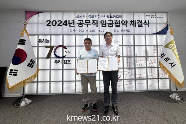 김포시(시장 김병수)와 김포시청금사모노동조합이 지난 19일 2024년 임금협약을 체결했다. 주요 협약 내용은 전 직군 기본급 3% 인상이다.