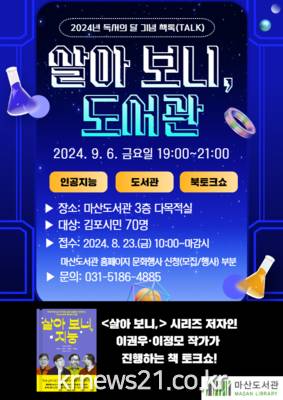김포시 마산도서관(시장 김병수)은 독서의 달을 기념하여 오는 9월 6일 금요일 19시부터 21시까지 마산도서관 3층 다목적실에서 ‘살아 보니, 도서관’을 운영한다.