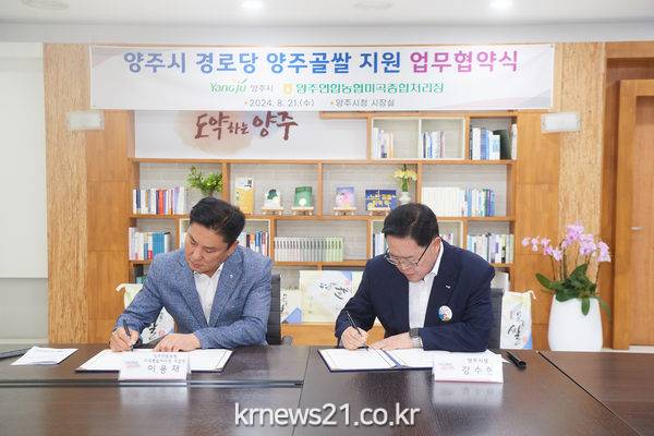 이날 강 시장과 이 조합장은 업무 협약서에 각각 서명하고 경로당 양곡을 지역특산품인 ‘양주골쌀’로 지원을 통한 어르신들의 급식 수준 향상과 건강증진 도모는 물론 우리 농산물을 적극 활용한 지역 농업 활성화를 위해 상호 협력하기로 약속했다.