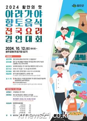 함안군은 오는 10월 12일(토) 함주공원(주경기장 입구)에서 열리는 2024 ‘함안의 맛’ 아라가야 향토음식 전국요리 경연대회 참가자를 이달 16일부터 오는 9월 20일까지 모집한다고 밝혔다.