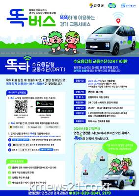 연천군 관계자는 “버스 노선이 적고 배차간격이 긴 마을의 교통불편이 다소 해결될 수 있을 것으로 보인다”며 “더 많은 주민과 관광객들이 똑버스를 적극적으로 이용할 수 있도록 지속적으로 노력하겠다”고 말했다.
