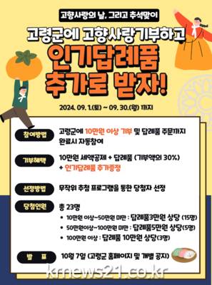 고령군(군수 이남철)이 고향사랑의 날(9.4.)과 추석을 맞이하여 9월 한 달간 고향사랑기부 특별이벤트를 시행한다. 이벤트 기간 중 온라인 또는 오프라인으로 고령군에 10만 원 이상 기부하고 답례품 신청까지 완료하면 자동으로 응모된다.