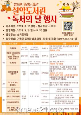 도서관 관계자는 “도서관에서는 독서는 물론, 삶을 풍성하게 해 주는 다양한 프로그램들이 운영되고 있다”며 “이번 독서의 달 행사를 통해 군민들이 도서관과 친해져 도서관 이용 및 독서 활성화에 많은 도움이 되기 바란다”라고 말했다.